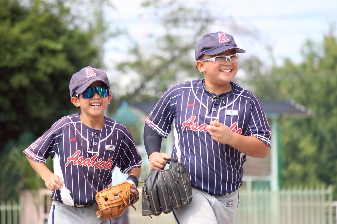 ベンチに補食のおにぎりを見つけ、満面の笑みで守備から帰って来る彼(左)