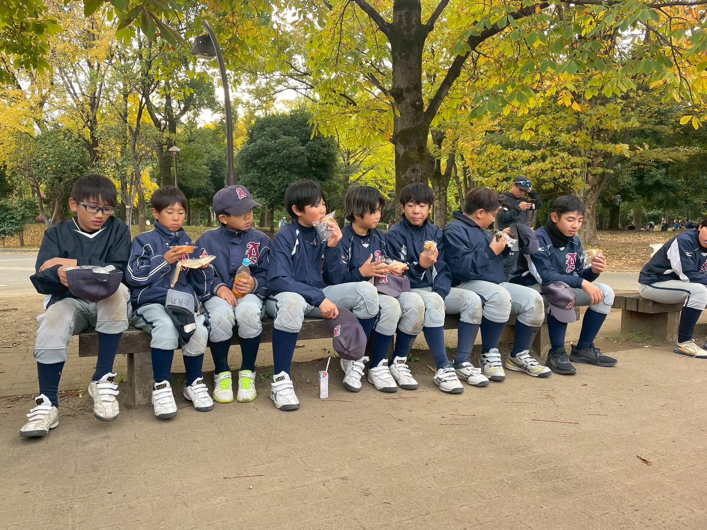 試合前にベンチに一列でおにぎりチャージして挑んだこの試合、旭町ナインが躍動しました。