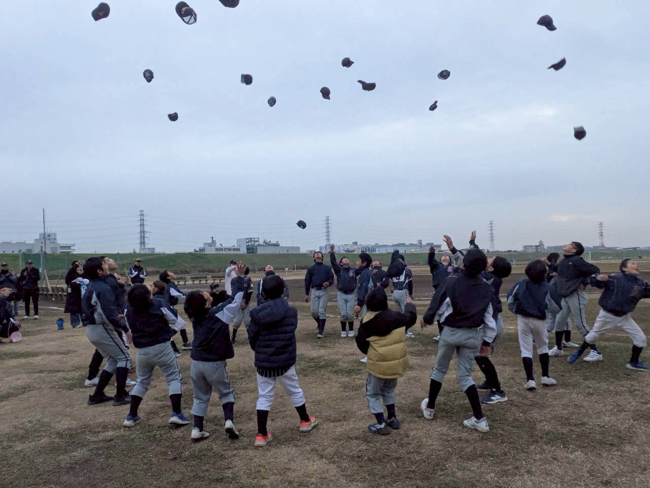 試合後は、保護者も低学年も全員集合。記念写真を撮って、帽子を空に投げて。